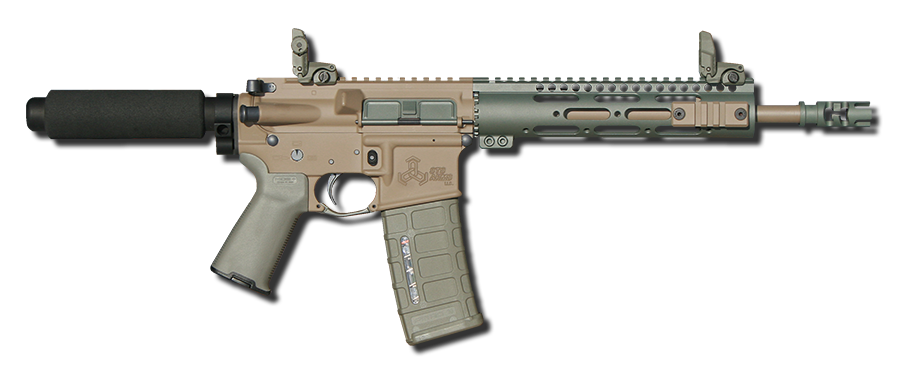 Note: Pistol shown with optional 11.5" barrel and in Flat Dark Earth and Foliage Green accents, Pmag.